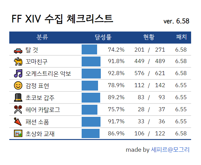 -탈 것, 꼬마친구, 오케스트리온 악보, 헤어 카탈로그, 감정 표현, 초코보 갑주, 패션 소품, 초상화 교재의 획득처와 거래 가능 여부, 획득 현황을 기록합니다. (v6.58 기준)